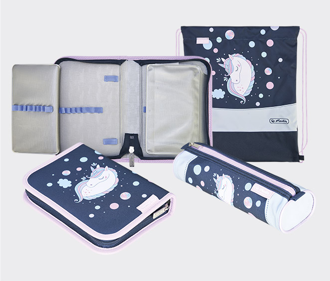 All designs include an empty pencil case with 2 flaps, an oval pencil pouch and a sports sac.