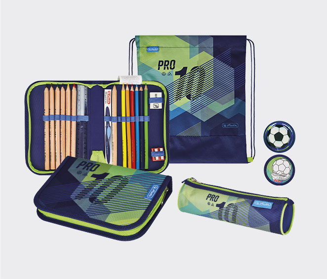 Wszystkie wzory zawierają piórnik z 16 elementami, okrągły piórnik, worek sportowy i 2 wymienne aplikacje na rzep.